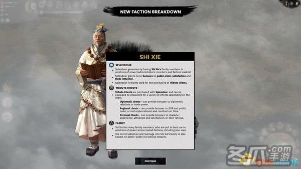 2、贡品宝箱:当显赫值积累到一定数量后可转化为贡品宝箱。这类宝箱属于特殊的随行物品,可为人物提供各种加成。宝箱共有三种类型――外交宝箱、地区宝箱和个人宝箱。外交宝箱可加强人物的外交关系;地区宝箱可为人物所在的区域增加部队补员和削减建造时间;个人宝箱可升级人物或他们的部曲。宝箱会在装备后打开并提供特定的效果,其效果将在20回合后耗尽。贡品宝箱可用于交易,或用于外交以促成协约。