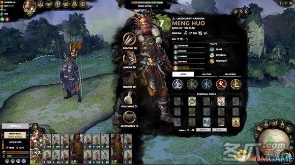 在南蛮诸部当中,孟获有着举足轻重的地位,也以执拗且残忍的作风而著称。他对朋友忠义无双、对敌人残忍无情。坚毅却一意孤行的性格在带给他成功的同时也招致了诸多麻烦。孟获的脑中惟有一个信念――成为南蛮之王。为此,他也不得不寻求邻邦的协助,以扩张其统治的范围。