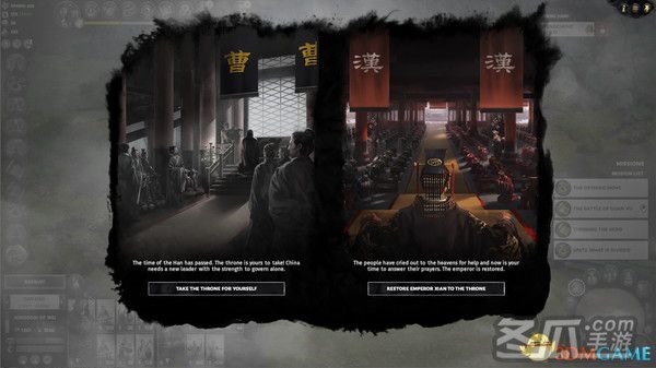 玩家可以选择自行称帝或是保护天子,以摄政王自居。此二者间的抉择很大程度上取决于在战役过程中所走的同盟路线。