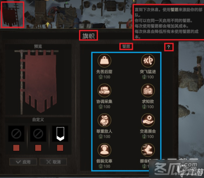 战争传说wartales旗帜,可消耗影响力来激活不同的誓愿