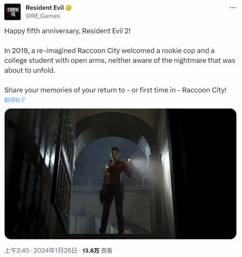 生化危机2re是卡普空发布的一款重置版生化危机游戏,这款游戏发行至今已经有五年了,卡普空官方也是在社交媒体发布了相关的游戏周年庆贺,下面就和小编一起来看一看吧。